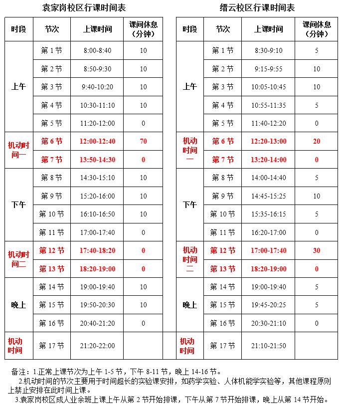 '; } else{ document.getElementById(PLTS[cur1].portletId).innerHTML=response; } } catch(e){} var regx=new RegExp(' 新的行课时间表,将中午及下午的机动时间排上了节次,即在原13节的基础上增加到17节。上午、下午、晚上正常的上课时间不变,只是节次发生了变化。新行课时间表从2017-2018-2学期启用,具体如下: