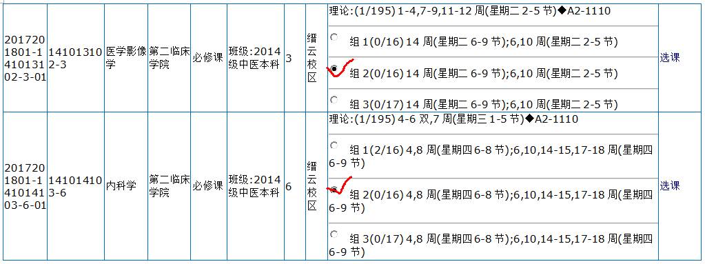 各院系、学生处: 为适应学校学分制改革的需要,学生的所有课程(含必修课、限定选修课和公共选修课)均须通过教务系统进行选课,选课成功后才能进行后续的学习。根据学校的统一安排,2018-2019学年第1学期的必修课选课时间为2018年7月3日8:00至2018年7月13日。所有学生(包括在教学基地的)均须根据本专业培养计划要求,及时进入教学管理系统选课,现将有关事项通知如下: 一、登录系统 学生登录校园网主页(www.cqmu.edu.cn)→点击“教学管理系统”→“教学管理系统”(或直接登录网址:http://jiaowu1.cqmu.edu.cn:8080/eams/manageLogin.action)→ 输入学号及密码,点击【登录】。 如果忘记密码且没有维护邮箱,导致无法登录系统,请学生携带个人有效证件到相应学办重置密码。 建议学生使用谷歌浏览器、火狐浏览器登录系统选课。 二、选课操作 1.在【我的教学】主菜单中点击【选课】菜单,选课前,请认真阅读“注意事项”。点击“可选课程”,点击课程后面的【选课】按钮。如有实验分组,请一定注意选择实验组数,再点击“选课”。 2.在【我的教学】主菜单中点击【已选课程查询】,查看选课结果和教学日历。 三、选课前,请以下班级的学生务必阅读实验分组选课指南 2015级:2015级生物工程本科,2015级预防本科,2015级中医本科,2015级临床一系1班、2班、3班、4班,2015级临床本科二系1班、2班,2015级儿科本科,2015级麻醉,2015级临床医学儿科班(5+3),2015级临床医学(5+3),2015级临床本科三系、2015级专升本,2015级药物制剂本科。 2016级:2016级临床本科一系1班、2班、3班,2016级临床本科二系,2016级儿科学本科,2016级医学影像技术本科,2016级口腔本科,2016级预防本科,2016级临床医学儿科班(5+3),2016级临床医学(5+3),2016级中西医临床医学本科,2016级基础医学,2016级生物工程本科,2016级法医本科。 2017级:2017级医学影像技术本科,2017级中西医临床医学本科,2017级中药制药本科,2017级临床药学本科,2017级中药本科,2017级医学影像技术本科,2017级康复本科,2017级医学信息工程本科,2017级信息管理本科。 四、选课注意事项 (一)本次选课名额充足,在规定时间内均可选到所需的课程,原则上必修课程需要全部选修。 (二)如课程有实验分组,请一定注意选择实验组数。如果课表时间不冲突,建议尽量选择相同的实验组号,尤其临床类实验/示教课,如下图。具体见附件《2018-2019-1学期实验分组选课指南》